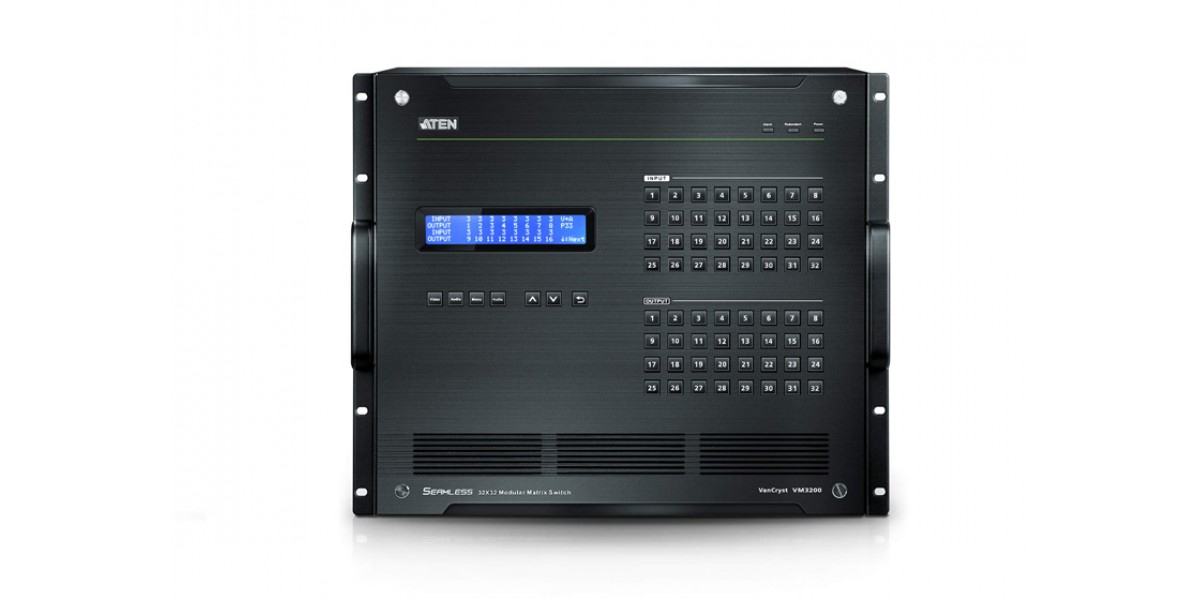 Модульный матричный коммутатор VM3200 обладает, реализованными в едином корпусе передовыми возможностями доступа и управления в режиме реального времени, несколькими локальными и удаленными аудио/видео устройствами и дисплеями. Просто нажимая кнопки на передней панели коммутатора VM3200, пользователи могут независимо переключать и направлять видео и/или аудио содержимое на различные устройства отображения (мониторы, дисплеи, проекторы) и/или звуковые динамики. Встроенная функция масштабирования (скейлер) надлежащим образом преобразовывает поступающие форматы видео для обеспечения плавного переключения изображения в режиме реального времени. С помощью расположенного на передней панели ЖК-экрана можно выполнить быстрый просмотр активных подключений к портам коммутатора. При этом существует возможность выбора режима EDID, которая позволяет установить лучшее разрешение на разных мониторах.