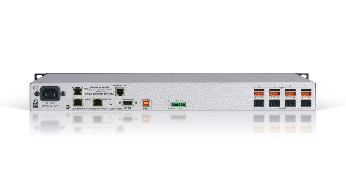 В модель TesiraFORTÉ AVB VT4 добавлена функция передачи цифрового звука по сети с использованием стандарта Audio Video Bridging (AVB). Модель с поддержкой AVB может использоваться как отдельное устройство или в сочетании с другими устройствами TesiraFORTÉ AVB, серверами Tesira, блоками расширения, оконечными устройствами и контроллерами.